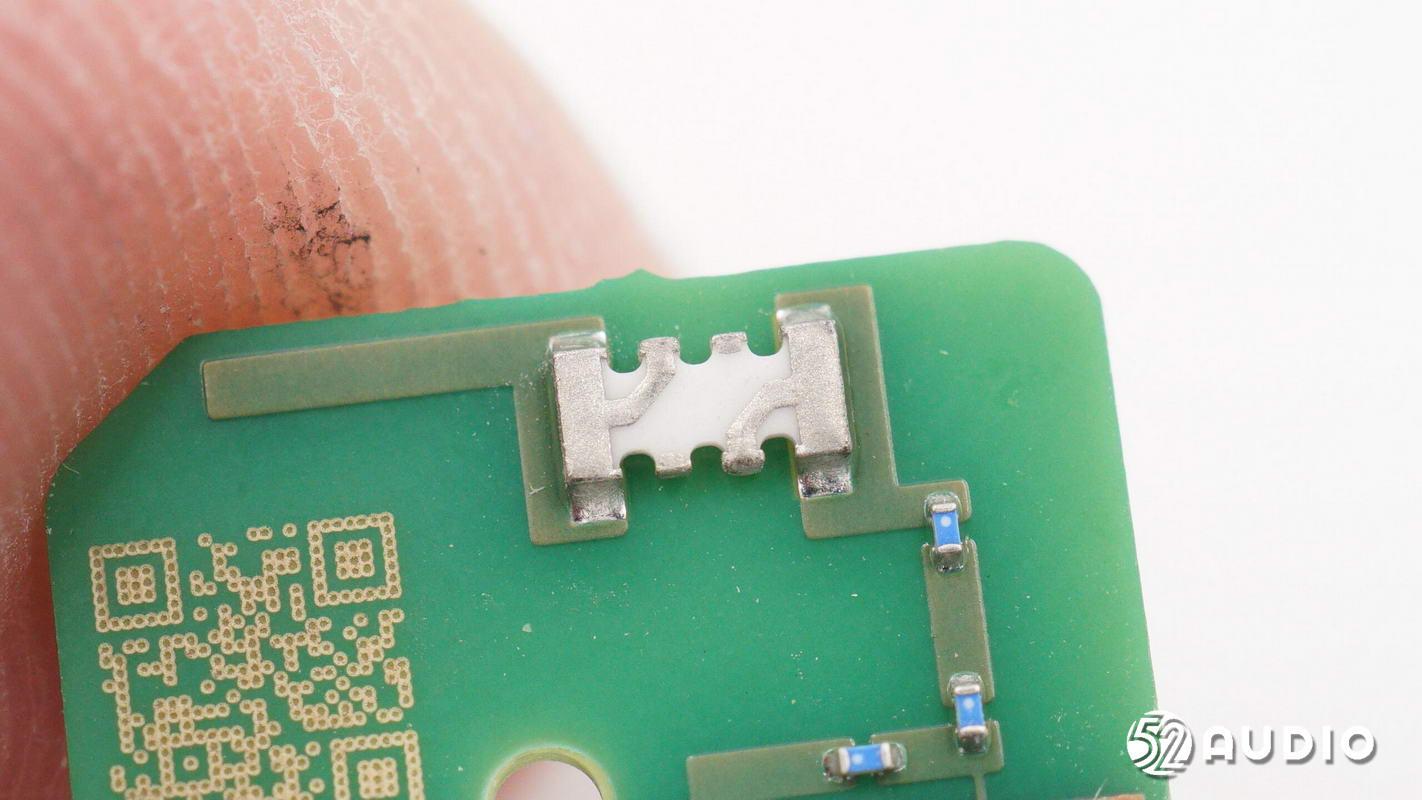 接收器主板上的金属弹片特写,用于和金属蓝牙天线接触为接收器主板提供蓝牙信号。