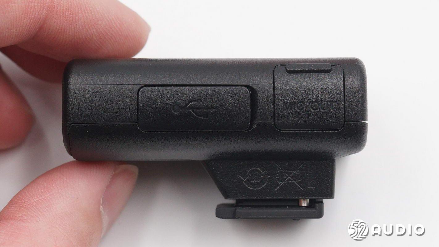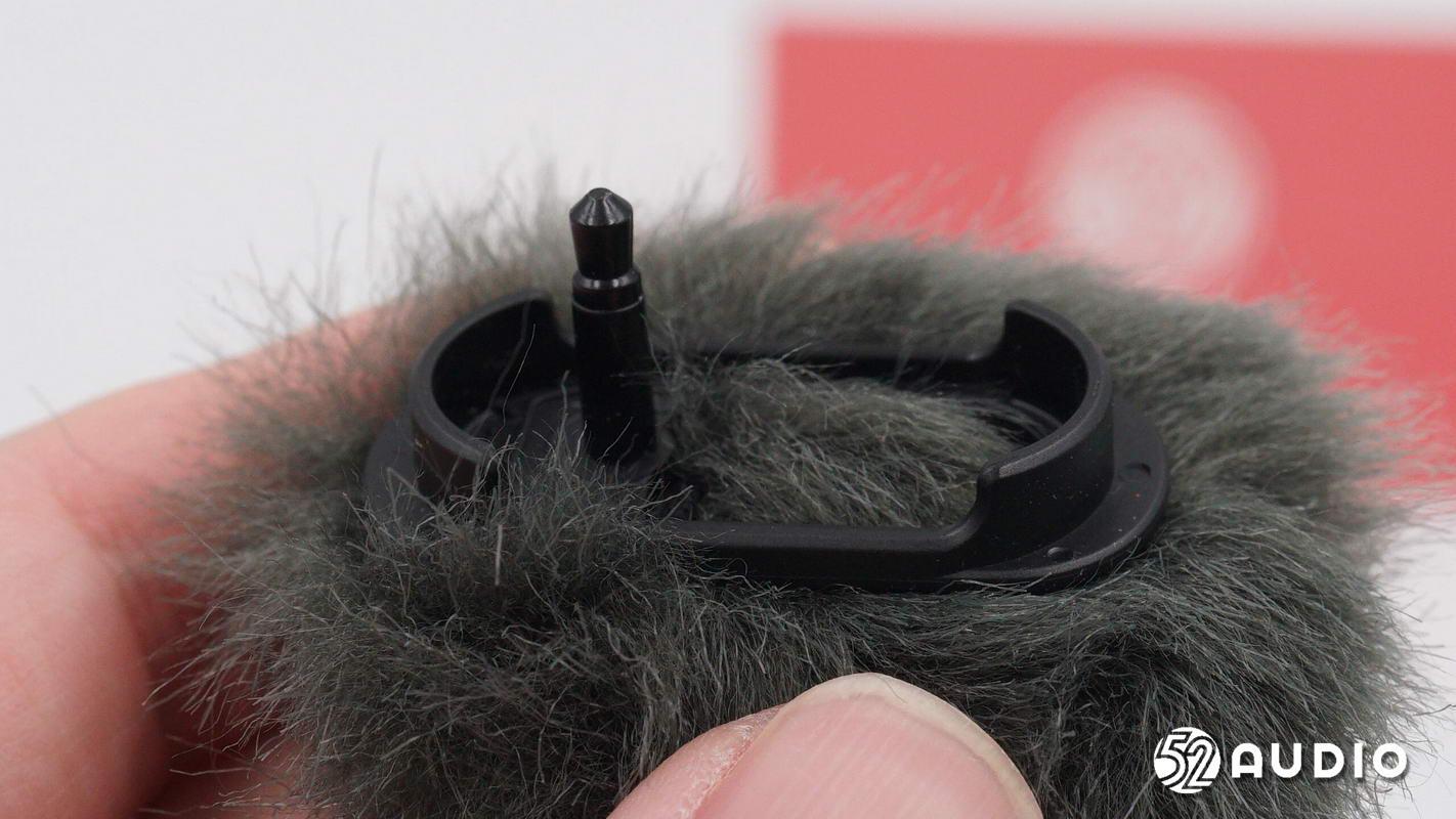 机身顶部设置格栅式拾音孔,内部金属网罩防护;还设置有3.5mm TRS输入接口,可以外接领夹麦和固定防风毛套。