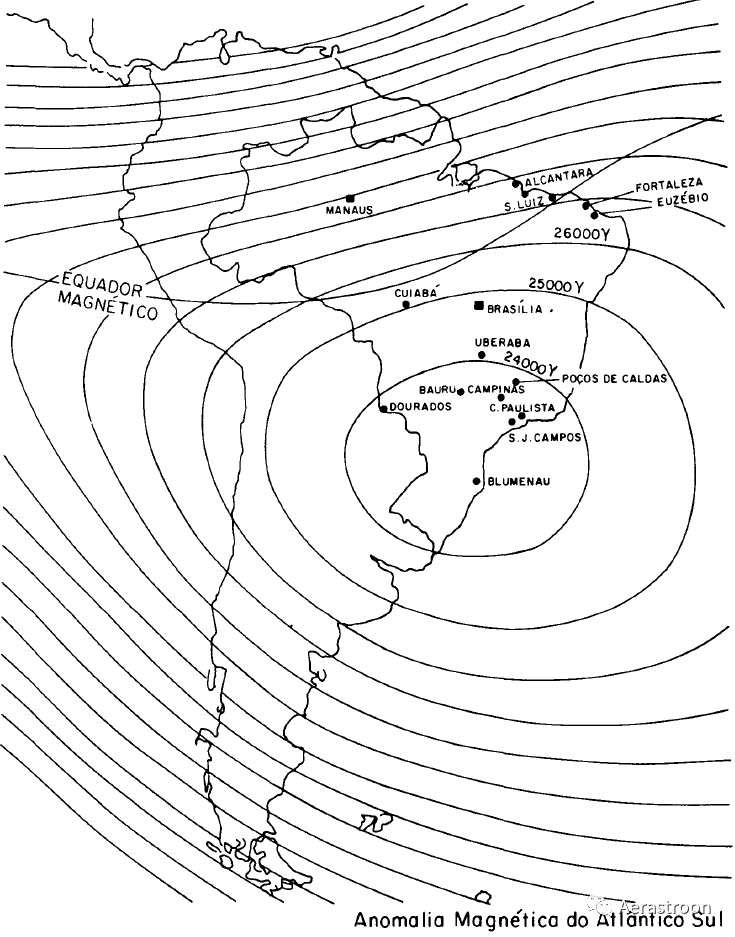 图1 1968年至1990年在巴西使用的平流层气球的发放地点和巴西的磁异常区域,(以等高线图显示)
