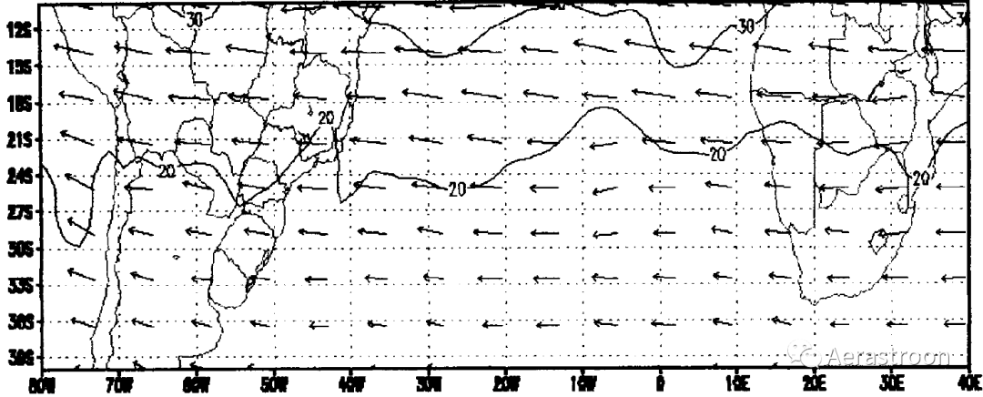 通过使用INPE收到的气象卫星信息进行持续的气候监测,为确定长期飞行的安全条件提供了必要的数据。INPE的天气预报和气候研究中心(CPTEC)拥有超级计算机能力,为安全发放和有效载荷的回收提供了必要的天气预报支持。特别是,根据CPTEC提供的分层风矢量信息和过去的飞行轨迹,已经开发并成功测试了一个预测有效载荷轨迹的工具,这有助于保证在人口密集地区上空的飞行安全,并可以预测清晰的着陆区域。图2显示了2001年1月CPTEC提供的INPE气球发放设施所在地区的20hPa的风向图。
