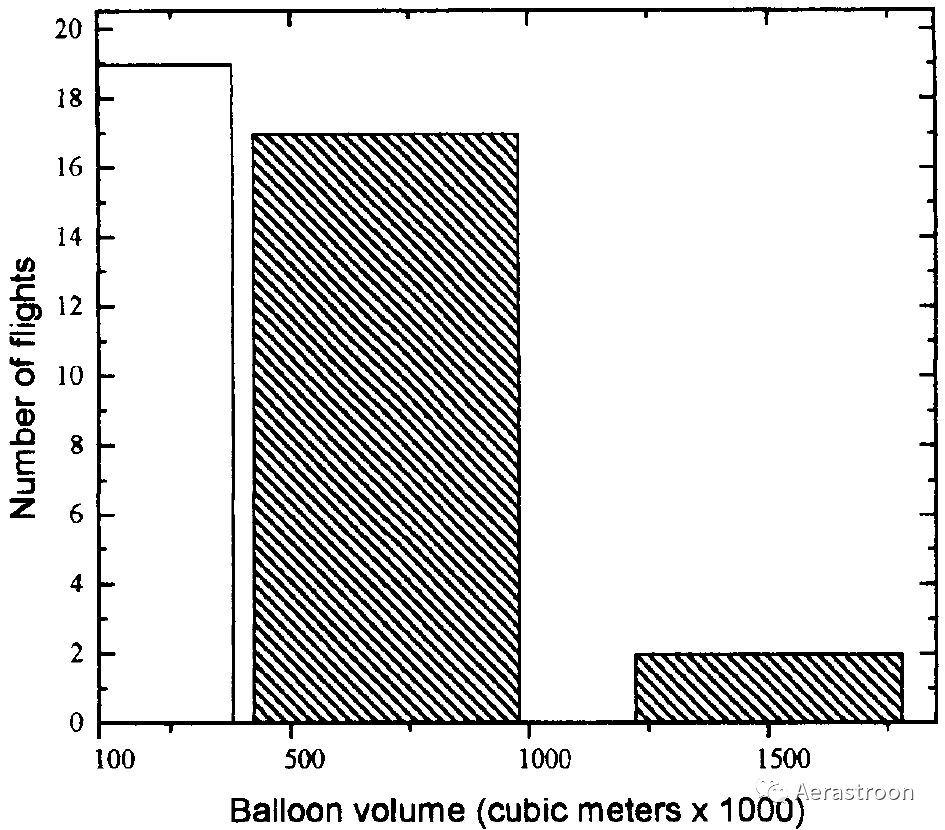 在过去的三十年里,巴西已经进行了100多次气球飞行。这些飞行中有相当数量是通过国际合作进行的。图3显示了使用体积从10万到150万m3的气球的飞行次数。