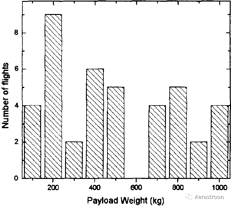 图4显示了在巴西通过INPE发放的实验数量,其有效载荷重量高达1,050kg。