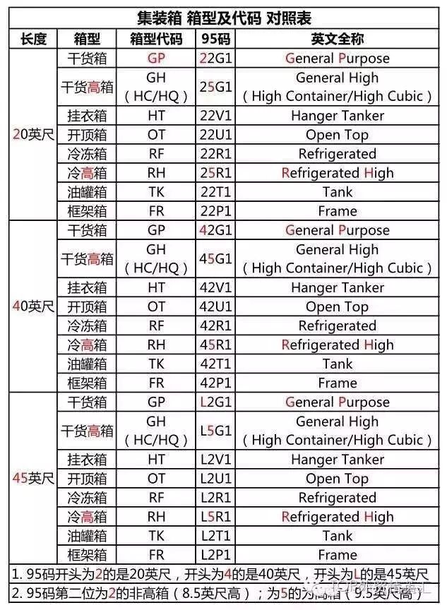 3)95码第一个字为2是20英尺,4是40英尺,L是45英尺。