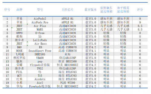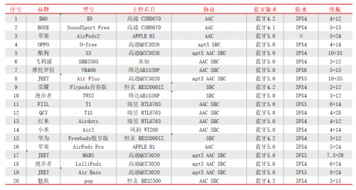 最后一部分,是推荐环节了,这20款真无线蓝牙耳机的配置如下表,可以看出,其实大品牌的配置也不一定就是最高的。