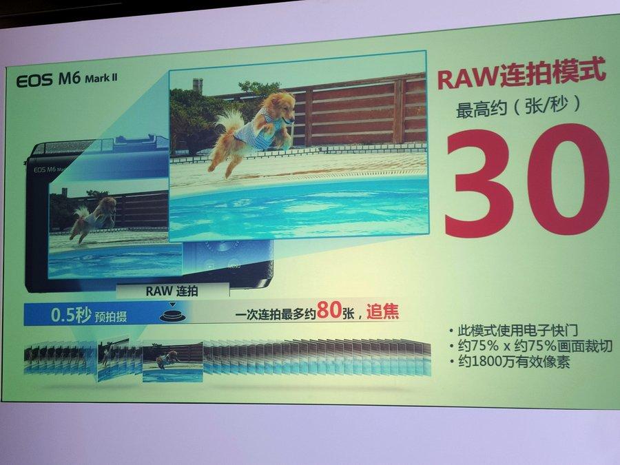 同时佳能EOS M6 Mark II也是佳能首款支持RAW连拍模式的EOS机型,在该模式下使用电子快门可以在AF追踪模式下,EOS M6 Mark II可实现最高约30张/秒的连拍速度,并且一次最高可拍摄约80张照片。此外,该连拍模式还加入了预拍摄功能,相机可记录完全按下快门按钮前约0.5秒的图像,当面对难以预测的高速运动拍摄体时,这一功能会进一步提高拍摄成功率。
