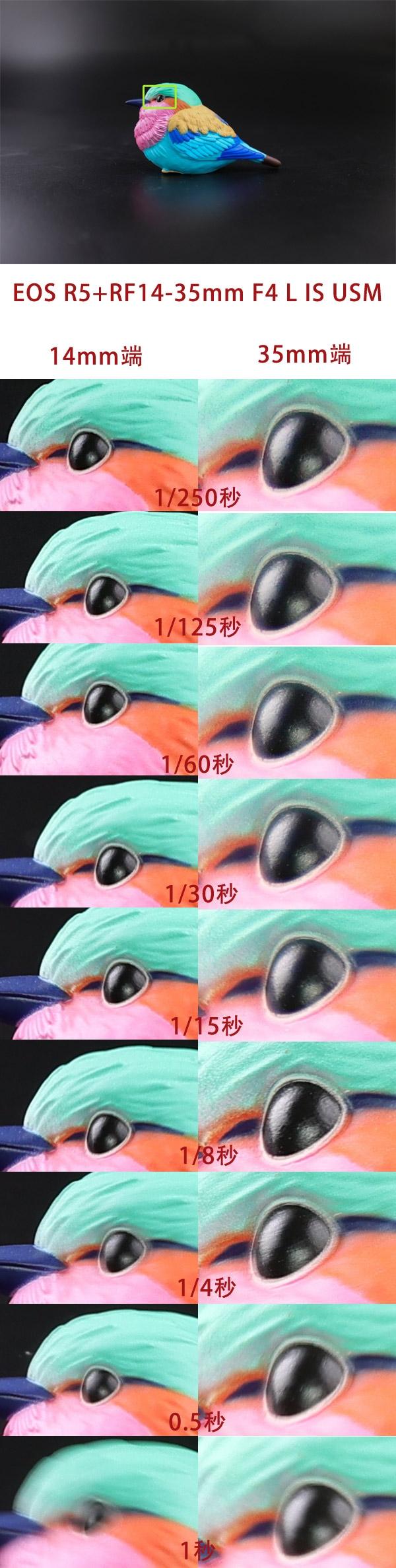 整个测试过程中,笔者都是手持相机且以较近距离拍摄(全焦段最近对焦距离为0.2米),可以看到,14mm端在1/250s到0.5s范围内,35mm端在1/250s到1s范围内,焦点都比较清晰,随着快门速度进一步减慢,焦点处开始出现抖动,考虑到实际拍摄中很少拍摄如此小巧的物体,在实际拍摄中使用更慢的快门速度也能保证画面稳定,这样稳定的防抖性能可以让我们更加灵活地使用低感光度及低速快门进行创作。