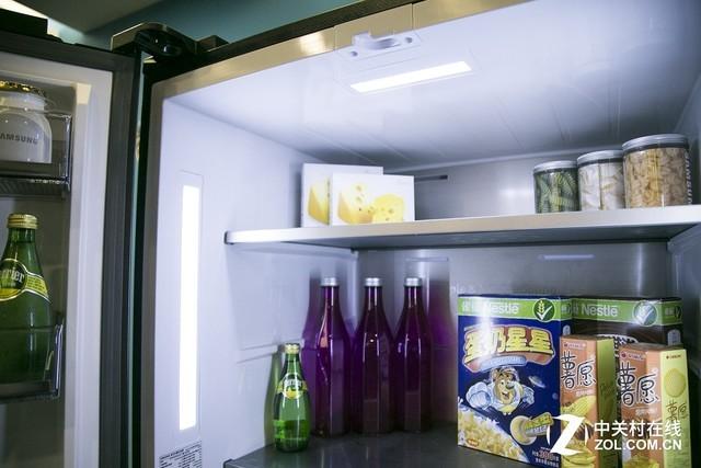 冷藏室是我们在夏季使用最频繁的区域,夏天丰富的新鲜食材和蔬菜水果都是放置在这一区域,尤其是我们夏天里最喜欢的冰镇饮料,如果冷藏室里没有足够的空间,那可就变得非常麻烦了。所以冰箱冷藏室的空间布局和整体结构对于我们的日常使用非常关键。在这款冰箱中,三星大大优化了冷藏室空间,我们在日常使用中,其实并没有太多过高的物品放入冰箱,这样我们冰箱中大部分纵向空间都是浪费的,整体空间利用率并不高。所以三星改变了冰箱内部结构,增加了隔板数量,相对减少了冰箱的纵向空间,增加冰箱在储存时的孔家利用率。