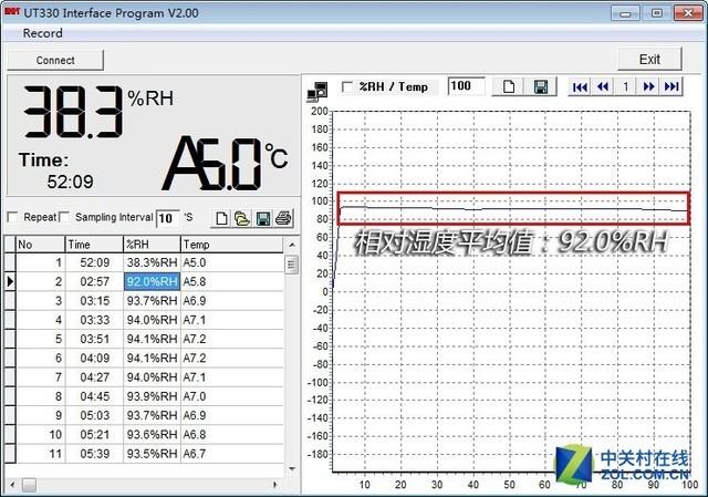 ④ 30分钟后取出湿度计,将数据导出制成曲线,同时记录最高值、最低值和平均值。