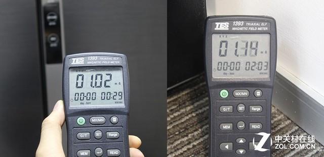 辐射工频段的单位是μT,辐射值在0.4μT以下,对人体危害微乎其微。通过测试,我们测得,冰箱前门处的辐射强度为0.102μT,冰箱压缩机处辐射强度为0.114μT。无论是前门还是压缩机处的辐射强度都远远低于安全值,所以这款冰箱的在辐射方面不会产生任何安全问题。