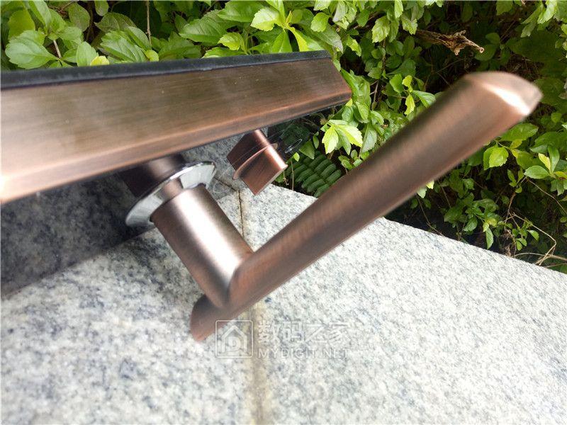 针对前后面板重点介绍一下基本构造,一副门锁包含室外和室内两个面板部分。先介绍室内面板构造。颜色共有2款:红古铜和土豪金。本人比较低调适合使用红古铜颜色。电镀锌合金一体锻造的面板。耐磨耐腐,流光溢彩的身形,触感极佳。