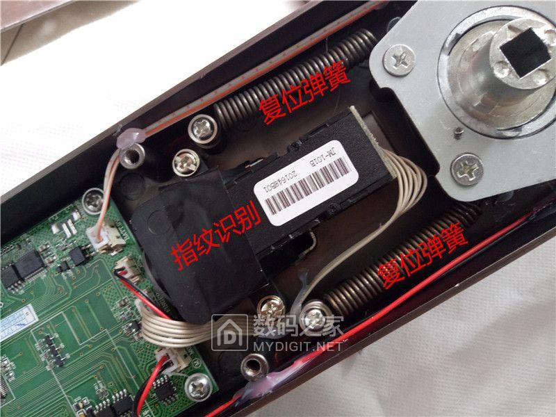 最上方是整机线路板。密密麻麻的零件看上去很有技术含量。指纹锁的核心部件:主板、微动电机,指纹采集器、密码技术、微处理器(CPU)、RF模块,Touch小板,存储单元。作为指纹锁来说,最重要的应该是算法芯片,也就是心脏要好,机械部分做的再好,如果认假度较高,随便谁的指纹都能开,那还有什么用呢?如下是官方的数据:指纹图像分辨率500dpi,指纹图像采集时间<0.5S,指纹对比<1S,指纹误识率<0.0001%,指纹拒真率<0.01%。这些数据充分体现了这款指纹锁的精确度。