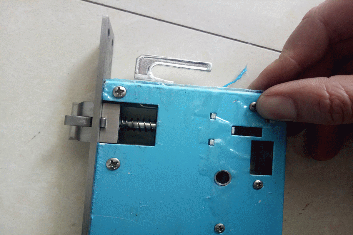 拆解原装的锁体,只需一把螺丝刀就可以搞定。卸下面板螺丝,取下锁芯帽,拆下侧板固定螺丝,取出内部的锁体,一气呵成不带喘气的。