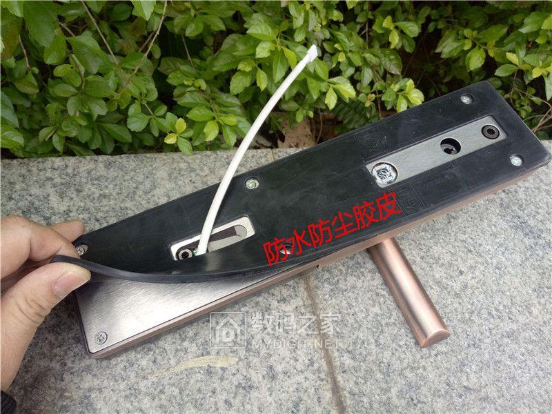 室外面板构造:贴有密码输入指引操作说明的保护膜,面板中间区域是指纹识别输入孔。内置有强穿透性蓝光指纹头识别系统,光学指纹处理比起半导体检测来的更加稳定和准确,识别率高达99.9%,而且识别不受镜面刮花影响。如下是官方的数据:指纹图像分辨率500dpi,指纹图像采集时间<0.5S,指纹对比<S,指纹误识率<0.0001%,指纹拒真率<0.01%。这些数据充分体现了这款智能锁的精确度。