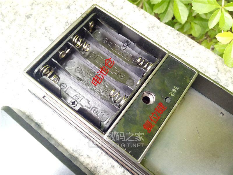 抽拉式电池仓,里面可以容纳4颗5号电池。相比上一代产品使用的8节电池来的更加节能了,功耗更低了。仔细查看上面还有一个用于初始化的复位键。