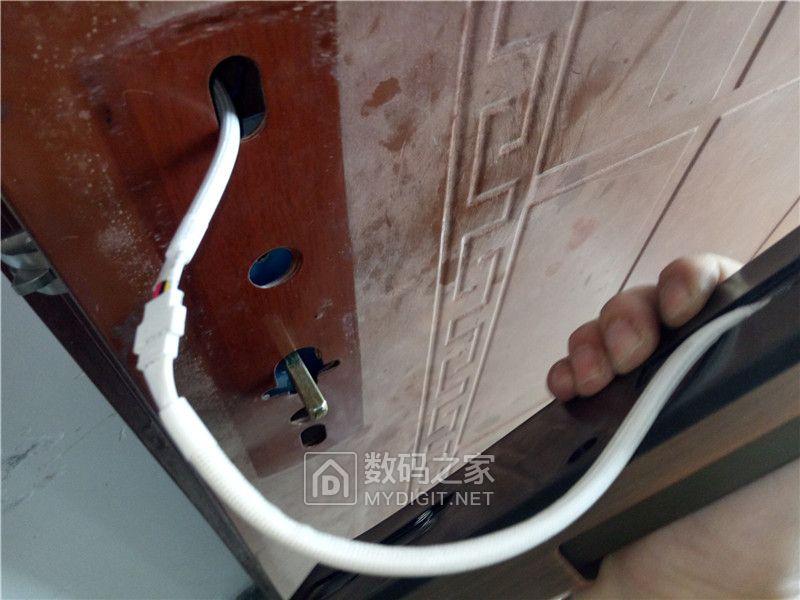 基本工作都做的差不多了,开始安装门锁吧!首先将电源线引到最上面的孔洞穿出。将室外面板贴紧防盗门。