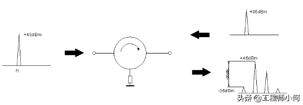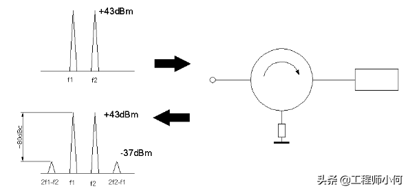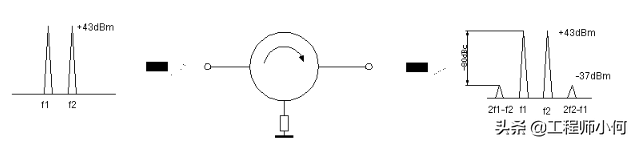 当两个载频同时输入环形器或隔离器时,在输出端口产生互调产物。正向传输互调的典型值为-80dBc@2x43dBm。