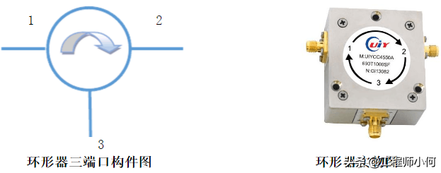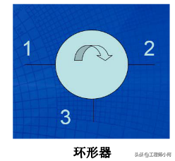 环形器是一个有单向传输特性的三端口器件,它表明器件从 1 到 2,从 2 到 3 和从 3 到 1 是导通的,反过来信号从2到1,从3到2和从1到3是隔离的。环形器是有数个端的非可逆器件。