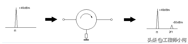 在大功率单载信号(f1)的作用下,环形器和隔离器会产生谐波(2f1、3f1等)。谐波的大小可用绝对值或相对值来表示,但同时必须说明载频的幅度。