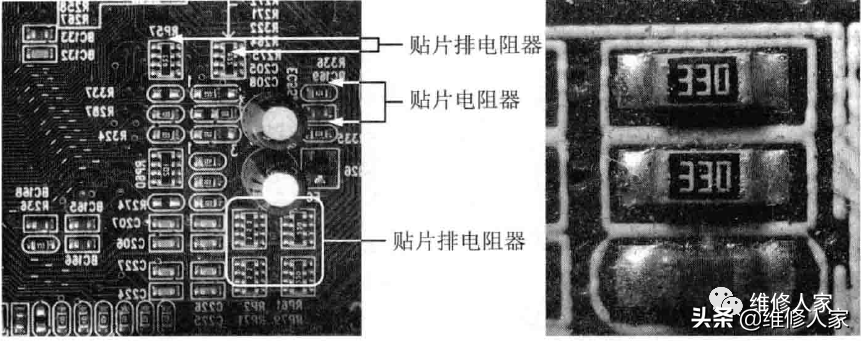 排电阻器(简称排阻)是一种将按一定规律排列的分立电阻器,集成在一起的组合型电阻器,也称集成电阻器或电阻器网络。适用于电子仪器设备及计算机电路,一般用RN表示。电路中的排电阻主要有8脚和10脚两种,其中8脚用得较多。在电路中,一般使用标注为“220”、“330”、“472”等的排电阻,其外形如下图所示。