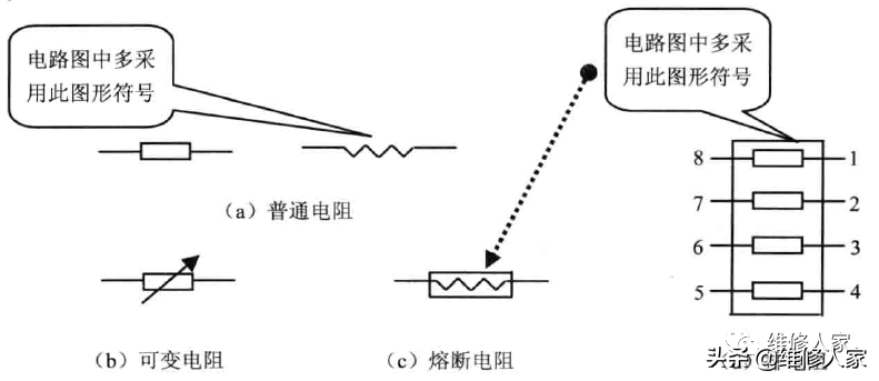 电阻器是一个限流元件,在日常生活中一般直接称为电阻。电阻器是电路元件中应用最广泛的一种,在电子设备中约占元件总数的30%。其质量的好坏对电路的工作状态起着至关重要的影响。在电路中,电阻器的主要作用是稳定和调节电路中的电流和电压,即起控制某一部分电路的电压和电流比例的作用。如该段电路的电流是固定的,则电阻器能制造固定的电压。如果该段电路的电压是固定的,电阻器也能制造固定电流。下图所示为电路中常见的电阻器。