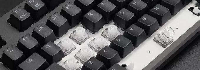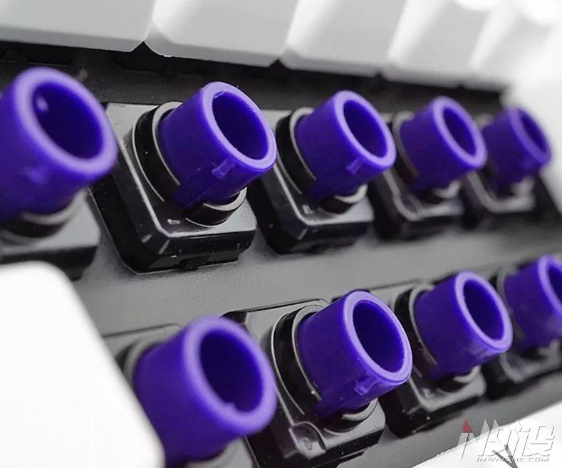 历经多年发展,Topre静电容键轴也并非一成不变。曾授权技术给酷冷,推出首款兼容MX轴键帽的静电容键盘:酷冷紫星,同时拥有更为骚气的定制紫色轴柱,而且价格相对亲民,在当时备受关注,也因此成为不少外设发烧友入手的第一款静电容键盘。圆柱口静电容键轴不再是唯一选择,RealForce RGB静电容键盘则是同样采用十字结构设计轴柱,加上自身标准108键配列,相对传统静电容键盘,直接兼容MX轴个性键帽,可玩性要高一些。与此同时,跟上时代步伐,RGB灯光元素也首次出现在其静电容键盘上。键轴外壳改成透明材质,并且采取上灯位设计,加入导光柱,RGB LED则是贴片式方案,在PCB主板上。结合新的双色注塑透光键帽,与白色钢板,实现均匀发光效果。