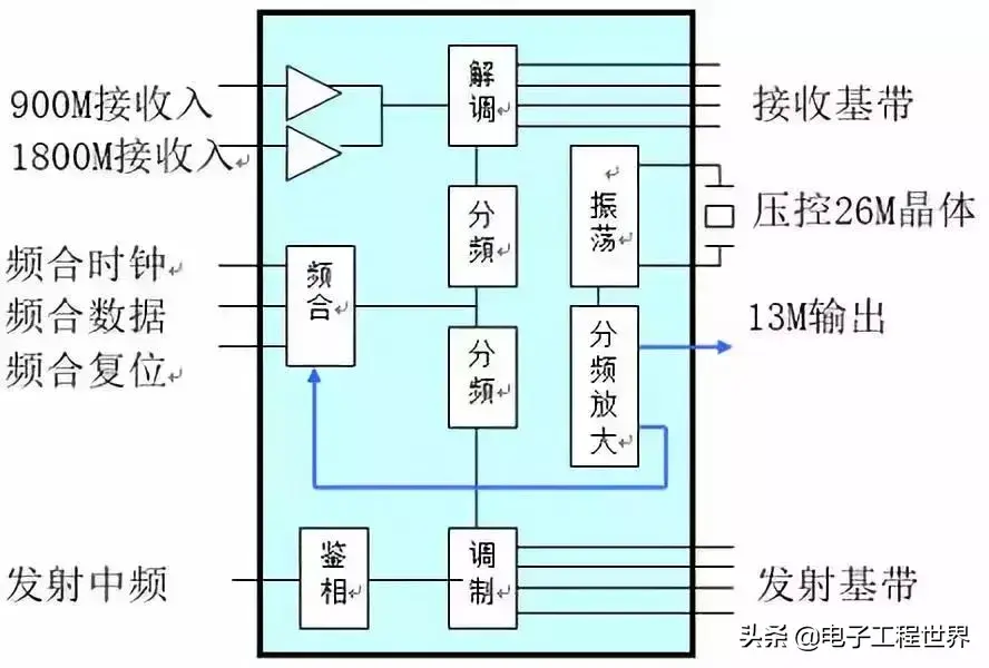 结构:由接收解调器、发射调制器、发射鉴相器等电路组成;新型手机还把高放管、频率合成、26M振荡及分频电路也集成在内部(如下图)。