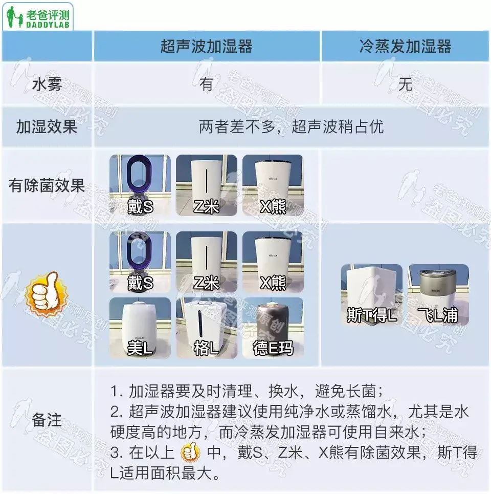 还有一种是冷蒸发加湿器, 最大的特征是看不到水雾 。以斯 T 得 L、美 D、飞 L 浦为代表,通过循环风将液态水变成气态水,实现加湿效果。这次购买的加湿器中,9 款是超声波的,3 款是冷蒸发的。