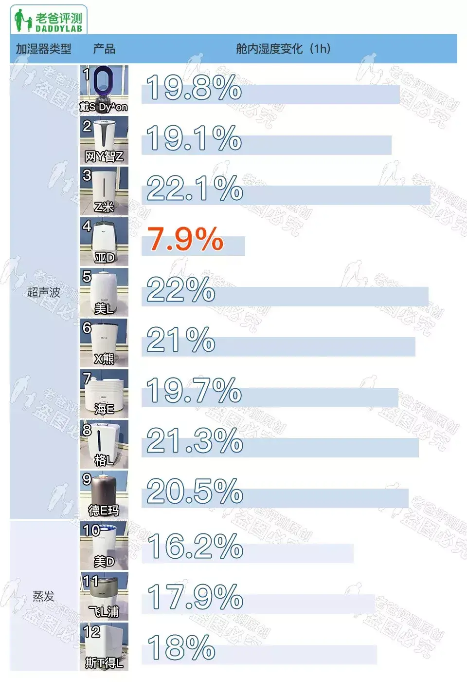 注:该结果综合了各产品的加湿量、实际加湿效果、除菌效果、使用体验等,数据仅针对测试样品,不涉及该品牌及品牌下其它产品,数据仅供参考。