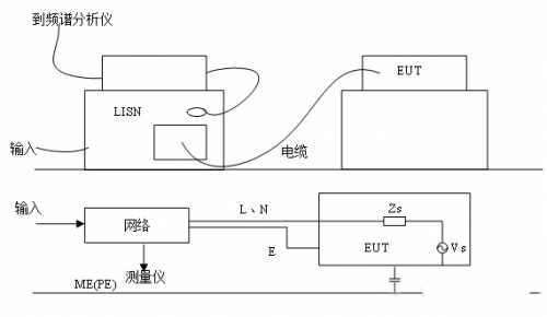 EUT 应该放在距离地面 80~90cm 高的实验台上,实验台表面为铺金属接地板的导电平面或非导电平面,一般以 EUT 实际使用的环境、地点来选择使用导电或非导电的实验台,比如便携式设备可置于非导电实验台上,安装在船舱内的设备需在金属导电实验台上进行测试。被测电源线通过电源阻抗稳定网络接到电网上,被测件的电缆可按所依据标准的要求摆放,选择不同的长度敷设。
