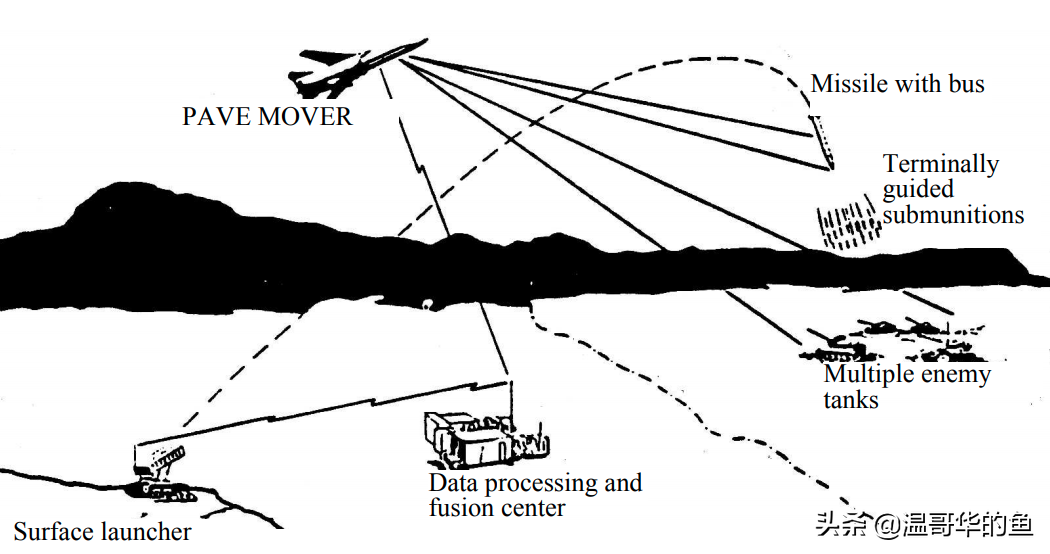 这是规模更加宏大的“Assault Breaker - 突击破坏者 ”计划的一部分,旨在通过大规模远程投射智能弹药阻挡华约的滚滚装甲洪流,尤其是在富尔达缺口这种关键地段。该系统由地对地导弹向战线后方的敌坦克集群投放“灵巧”子弹药,攻击装甲目标薄弱的顶部;由机载“Pave Mover - 铺路机 ”雷达平台提供战场监视和目标指示,这种新型合成孔径雷达具有移动地面目标指示能力。