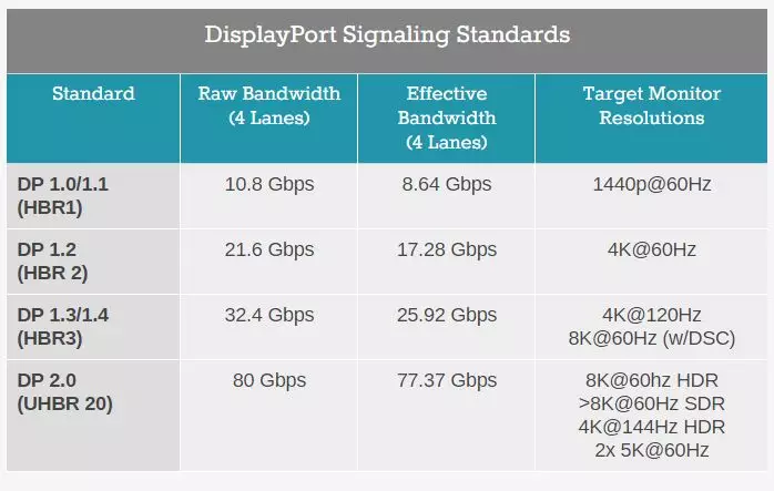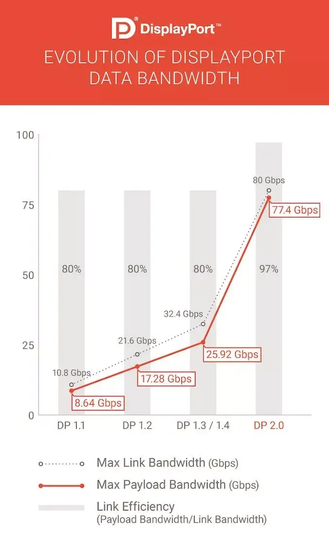 在此之前,DP 1.1、1.2、1.3/1.4的理论总带宽分别为10.8Gbps、21.6Gbps、32.4Gbps,但有效率都只有80%(8/10b编码),难以满足6K、8K高分辨率和高色深、高刷新率的需求。