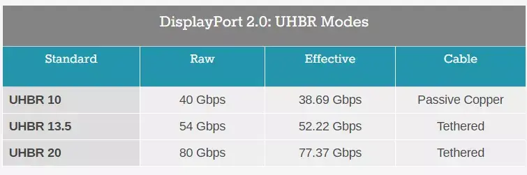 数据线方面,DP 2.0其实引入了三种不同机制,每通道带宽分别设定在10Gbps、13.5Gbps、20Gbps,VESA称之为“超高比特率”(UHBR/Ultra High Bit Rate),按照带宽分别叫做UHBR 10、UHBR 13.5、UHBR 20。