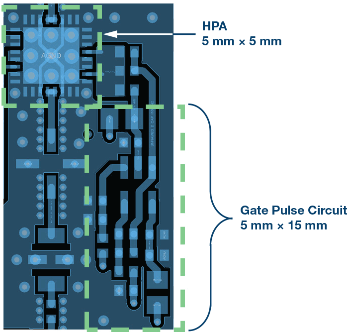 对一个代表性布局做了尺寸研究,如图6所示。栅极脉冲电路的运算放大器部分放置在通向HPA输入的RF路径附近。精密DAC未显示出来,假定其放置在控制部分中,为多个发射通道提供输入。布局研究表明,可将该电路添加到实际的低成本PWB实现方案中,发射RF电路所需的额外空间极小。