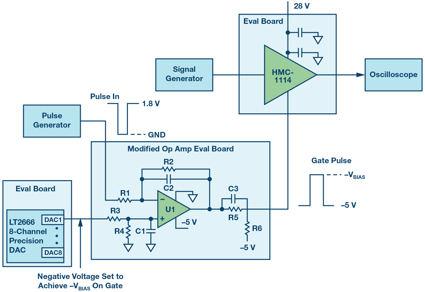 用于验证电路的测试设置如图3所示。对精密DAC、运算放大器和HPA使用评估板。一个脉冲发生器用于模拟1.8 V逻辑信号。信号发生器连续工作,利用一个输入带宽高于RF频率的RF采样示波器测量HPA对RF信号的开启/关闭。