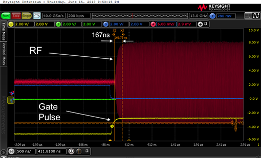 实测开启时间如图4所示。时间标度为每格500 ns,RF信号的上升时间小于200 ns。对于测量从栅极脉冲开始到RF脉冲上升沿结束的时间的系统,可以看到开启时间约为300 ns,这说明系统分配1s用于发射到接收转换会有相当可观的裕量。