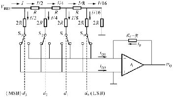 其特点是只有二种电阻阻值,精度可以做得很高;由于运放的反相输入端为虚地特性,开关切换时流过支路电流不变,只是流向反相端还是流向地端,所以没有过渡过程,转换速很快。