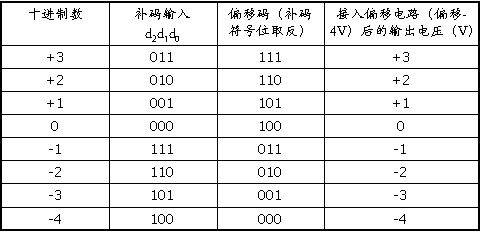 三位二进制补码输入时与之对应的偏移码和D/A转换器输出间的关系表: