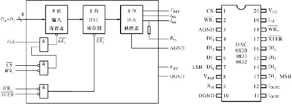 由1变0时,8位输入寄存器的数据锁存至8位DAC寄存器,并使8位DAC转换器的输出发生相应的变化。