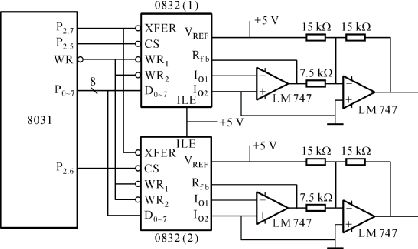 其中,DAC0832的输入数字量以及转换所需的各控制信号都来自单片机8031。