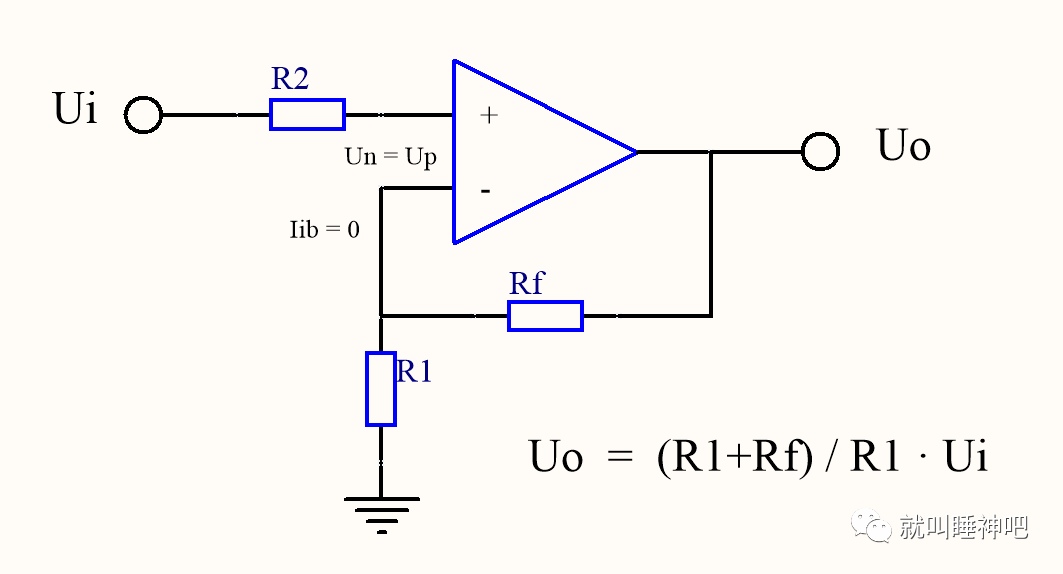 因为流进运放反相输入端的电流远远小于Rf和R1上的电流,如果忽略它(虚断),那么反相输入端的电压就是由Rf和R1对输出电压分压决定,即Un=R1/(R1+Rf)·Uo。同样地,忽略同相输入端的偏置电流,则R2电压为0,Up=Ui。又因为“虚短”,即Un=Up,所以就可以得到输出电压与输入电压之间的关系:Uo=(R1+Rf)/R1·Ui。