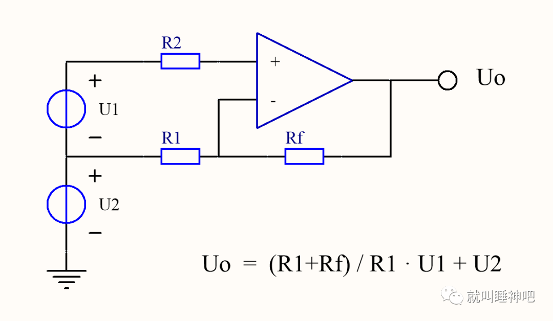 不过,并不是说放大电路的输出电压总是不含共模输入电压的成分。 比如下图电路,也就是在同相放大电路的输入端再加上共模电压U2,这个电路的输出就含有共模电压U2,即Uo=(R1+Rf)/R1·U1+U2。在单电源供电的运放电路中有时会在输入端加直流偏置,就属于这种情况。
