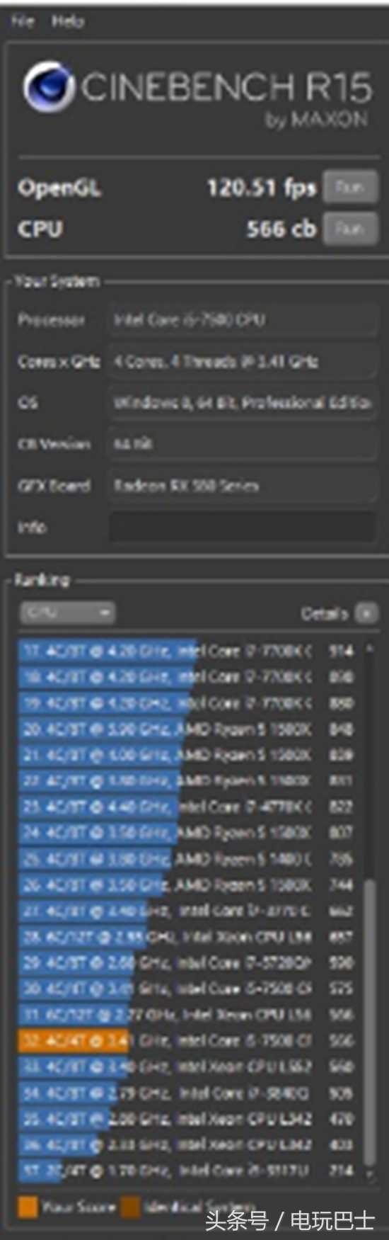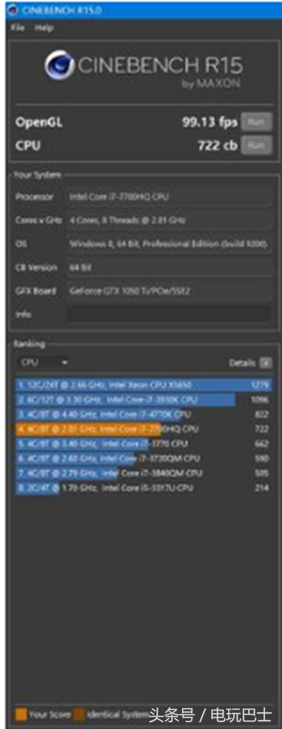 从图上我们可以看出,笔记本上搭载的i7-7700HQ分数为722分,而台式机上使用的i5-7500则为566分,差距还是相当大的,但是有一点一定要注意,笔记本碍于设计,工艺,模具等因素限制,整体体积较小,风扇并不能完全排出CPU的热量,对此OEM厂商在出厂时都会对CPU做一个”温度墙“的设定,当达到某个温度时,CPU便会降频运行,所以在游戏本上,CPU并不能一直“火力全开“的运行下去,而主机并没有这些烦恼,所以主机中的CPU可以一直以”火力全开“的性能运行下去,性能可以达到或超过i7-7700HQ。