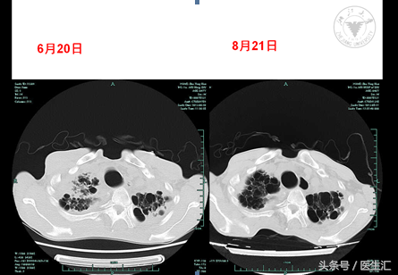 08-21增强扫描(一部位)):慢支、肺气肿伴两肺多发肺大泡;两肺间质性改变,左肺上叶病灶对比6月20日CT,部分病变有吸收好转。左上肺术后改变。两侧胸膜增厚粘连。