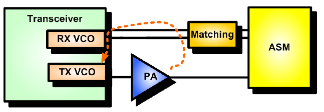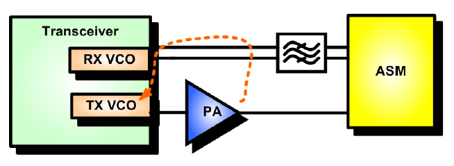 或是打到接收端VCO,再耦合到发射端VCO,产生VCO Pulling。