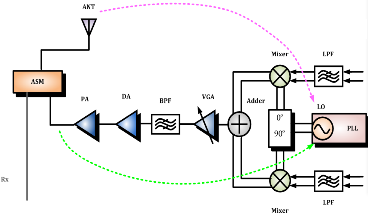 在零中频架构中,因为主频信号的频率与LO相同,所以有可能会泄漏并造成干扰,而整个发射路径中,最可能的泄漏来源为PA输出端与天线端,因为PA输出端的能量最强,因此会以传导方式干扰,而天线端则是会直接以辐射方式干扰,使调变精确度下降,导致相位误差,频率误差,以及EVM都会有所劣化。