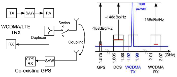除此之外,因为GPS接收的是-150dBm以下,极微弱的信号,因此当WCDMA与GPS功能同时开启时,被PA放大的带外噪声,有可能会影响到GPS: