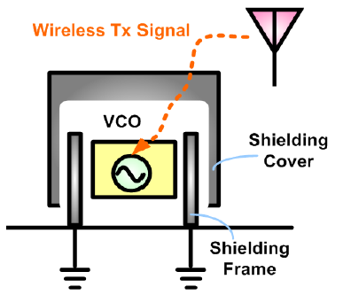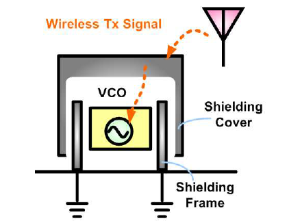 任何金属,若GND不完全,等同于辐射体,因此Shielding Cover与Shielding Frame的接触不够紧密时,亦即GND不完全,这时整个Shielding Can 会宛如一个共振腔结构,把残留在 Shielding Cover的Wireless信号,辐射出去,打到 VCO。