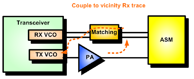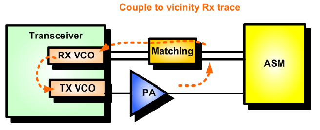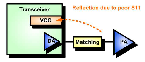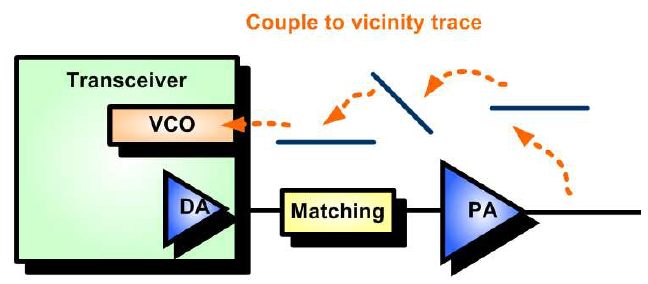 然而相较于PA输入端,由于PA输出端的能量更强,因此更可能会危害到VCO,因此更需特别注意。有可能通过其他邻近的走线,借由耦合的方式,产生VCO Pulling。