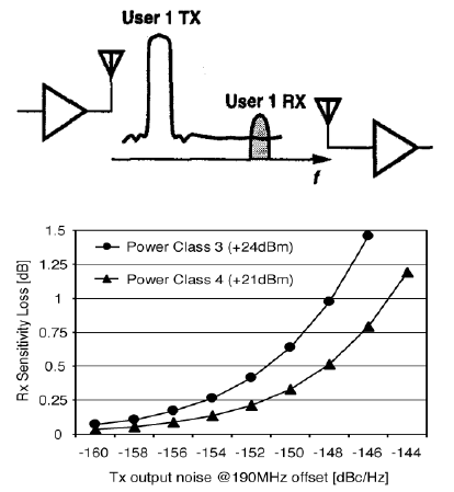 I/Q Modulation是直接将数字信号的I/Q信号,直接升频成RF信号,因此容易在混波过程中,产生带外噪声,若带外噪声被PA放大,进而增加LNA的Noise Floor,会导致灵敏度变差。换句话说,WCDMA接收端的灵敏度,除了会因Tx Leakage而劣化,也会因被PA放大的带外噪声而变差。