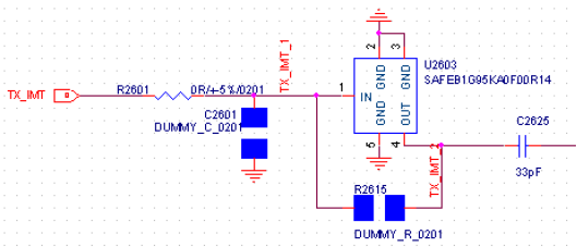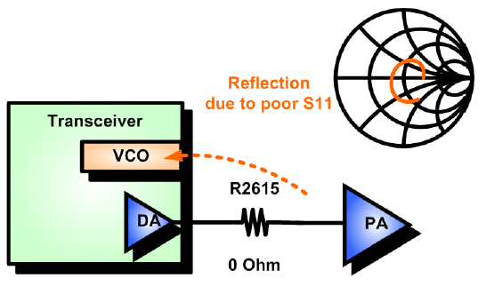 但是当R2615放0欧姆时,其发射信号会直接经过R2615,由于Layout走线关系,导致收发器看出去的S11不好,信号反射打到VCO,使得调变精确度下降,其相位误差与EVM变差。故此时应针对PA输入端的Matching再作微调,以减少反射。